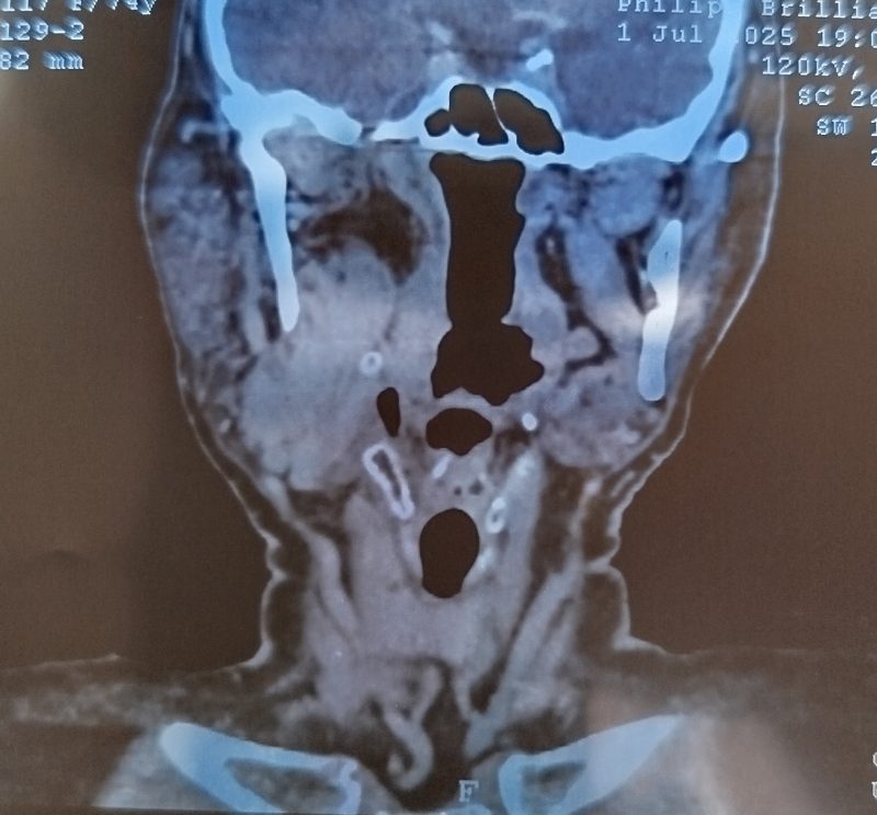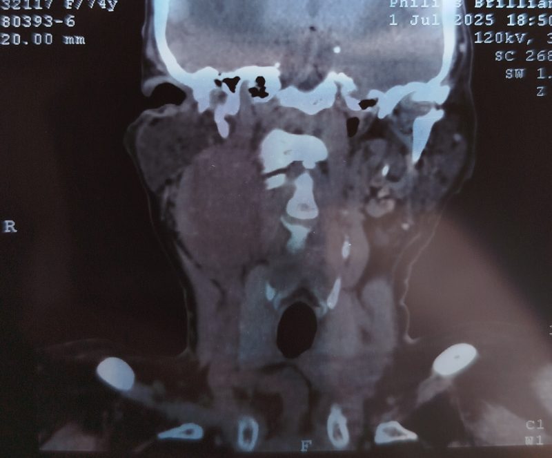 Пациент К. 1950 гр. Поступил в ООГШ 26.08.2025 с жалобами на новообразование шеи справа. Считает себя больным около 6 лет. В поликлинику по месту жительства обратился в июне 2025г. В рамках обследования было проведено МРТ шеи: В проекции каротидного и заднего шейного пространства визуализируется объёмное образование с четкими бугристыми контурами, размерами до 45х36х49 мм, с признаками интенсивного равномерного накопления контрастного вещества, с признаками ограничения диффузии. Внутренняя сонная артерия справа огибает образование, яремная вена на уровне образования достоверно не прослеживается- вероятно вовлечена в процесс. МР-картина объемного образования сосудистого и заднего шейного пространств шеи справа с вовлечением яремной вены? Направлен в БУЗ ВО «ВОНКОЦ» для уточнения диагноза. В поликлинике БУЗ ВО ВОНКОЦ выполнена ТИАБ (тонкоигольная аспирационная биопсия) образования шеи справа. Цитологическая картина — клетки атипии, дистрофии. Госпитализирован в отделение ООГШ для проведения хирургического лечения с целью установки морфологической верификации.