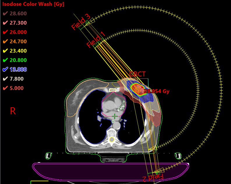 Сложность в расчёте таких планов для медицинского физика заключается в непосредственной близости области облучения к критическим органам (сердце, лёгкие, здоровая молочная железа). Важно не превысить дозу на молочную железу, в которой непосредственно находится планируемый объём лечения.