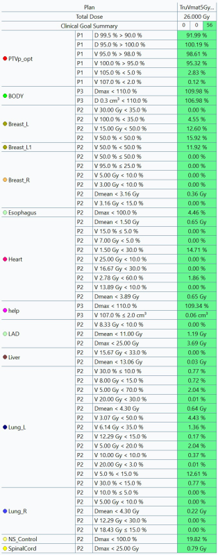 Благодаря современному оборуджованию и выбранной методики лечения удалось реализовать подведение дозы в очаг облучения таки образом, чтобы нагрузка на здоровые ткани была минимальна или находилась «в допустимых приделах», а так же получилось добиться комформного и равномерного покрытия в области облучения с резким спадом дозы за его границами.