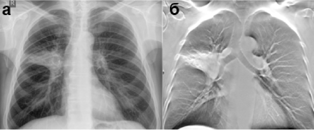 На рентгенограмме определяется ателектаз С3 правого лёгкого, тогда как на ТС хорошо видна ампутация В3.