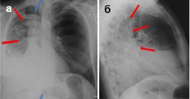 Воспалительные изменения правого лёгкого, пневмоторакс справа.