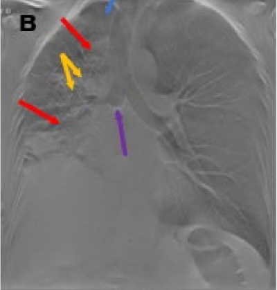 Оставленная верхняя доля правого лёгкого расправлена не полностью, уменьшена в объёме. Прозрачность оставленной доли снижена за счёт гиповентиляции и наличия на этом фоне неоднородного уплотнения лёгочной паренхимы, вероятно воспалительные изменения (красные стрелки), пневмоторакс (синяя стрелка). При ТС – отмечаются участки неоднородного уплотнения лёгочной паренхимы (красные стрелки), на этом фоне прослеживаются просветы бронхов (жёлтые стрелки).