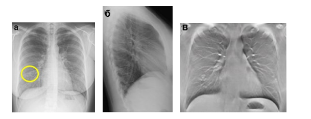 а – цифровая рентгенограмма ОГК в прямой проекции; б – цифровая рентгенограмма ОГК в правой боковой проекции; в – ТС ОГК.
