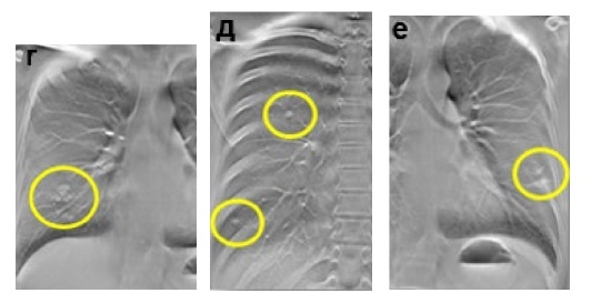 Метастатическое поражение лёгких: а – цифровая рентгенограмма ОГК в прямой проекции; б – цифровая рентгенограмма ОГК в правой боковой проекции; в, г, д, е – ТС ОГК.