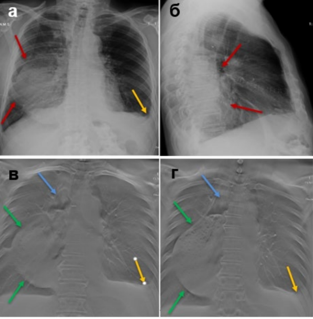 На рисунке состояние после лапароскопии, торакотомии, расширенной субтотальной резекции пищевода с одномоментной пластикой широким желудочным стеблем и анастомозом в плевральной полости. На рентгенограмме грудной полости в нижней доле правого лёгкого определяется фокус неоднородного уплотнения лёгочной паренхимы (красные стрелки) – воспалительные изменения? желудочный стебель? В левой плевральной полости гидроторакс (жёлтая стрелка). При ТС – в правом гемитораксе определяется расширенный желудочный стебель – гастростаз (зелёные стрелки) – с неоднородным содержимым, наличием в нем газа (синие стрелки). Гидроторакс слева (жёлтые стрелки).