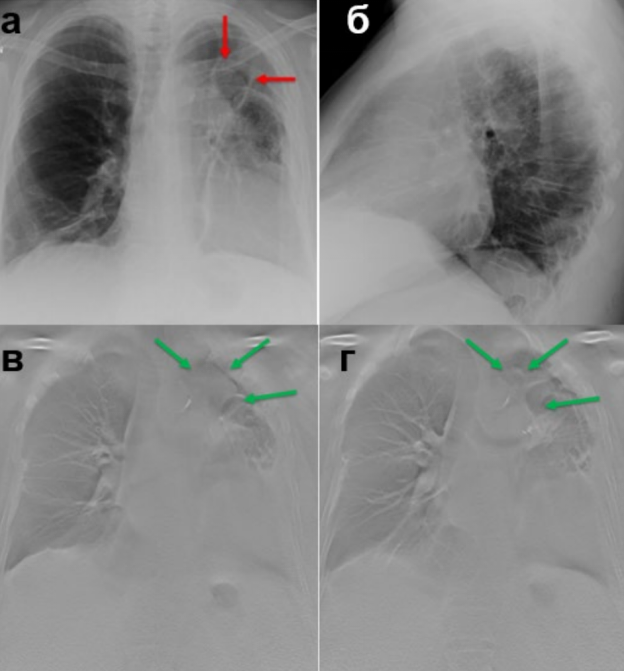 Состояние после реторакотомии слева, анатомической резекции 1-3 сегментов левого лёгкого. На обзорной рентгенограмме органов грудной полости – в проекции резецированных сегментов S1-3 определяется уплотнение с четкими неровными контурами – гематома? (красные стрелки). При ТС данные изменения выявляются более отчётливо (зелёные стрелки) – гематома.
