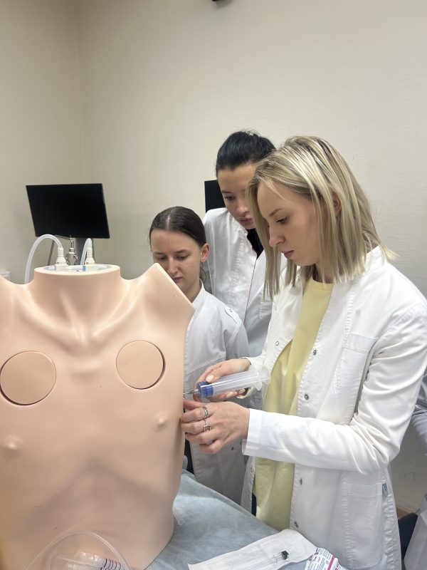 Преподаватели продемонстрировали технику выполнения торакоцентеза с учётом современных требований, включая выполнение пункции плевральной полости под ультразвуковым контролем, что значительно повышает безопасность и точность процедуры.