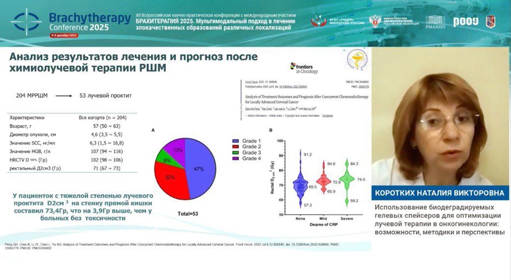5 декабря 2025 года в рамках XII Всероссийской научно-практической конференции с международным участием «Брахитерапия 2025. Мультимодальный подход в лечении злокачественных образований различных локализаций» (Москва, онлайн) прозвучал доклад главного внештатного специалиста онкогинеколога министерства здравоохранения Воронежской области, заведующей радиотерапевтическим отделением №5 БУЗ ВО «Воронежский областной научно-клинический онкологический центр» (ВОНКОЦ) – Наталии Викторовны Коротких: