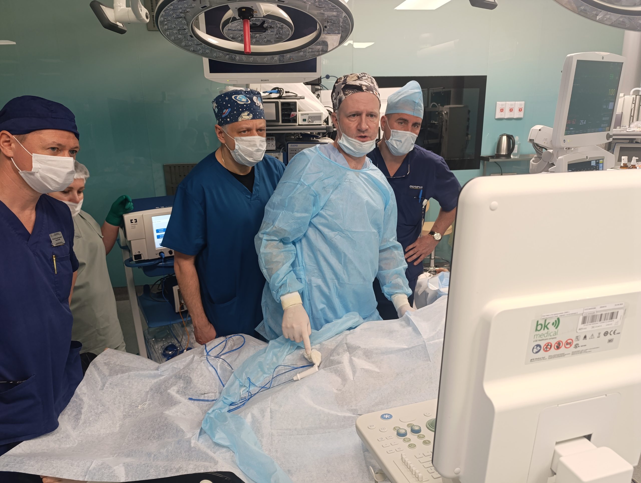 В мастер-классе приняли участие сотрудники отделения абдоминальной онкологии, а также врач-онколог высшей квалификационной категории, кандидат медицинских наук Борис Леонидович Гурвич. В онкоцентре он проводит пунктирование паренхиматозных органов для забора материала на исследование, применяет микроволновую абляцию, производит установку маркеров для лучевой терапии, позволяющей при проведении облучения пациента минимизировать смещение печени и повысить точность доставки дозы излучения к маркеру-мишени для эффективного щадящего лечения.