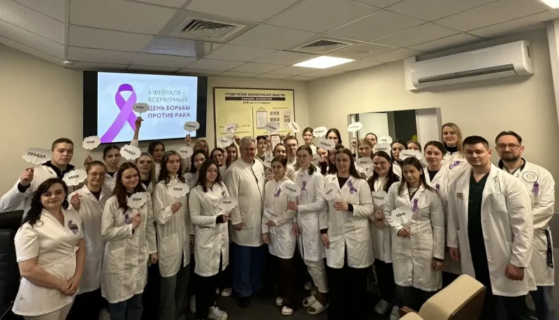 На кафедре онкологии ВГМУ им. Н.Н. Бурденко под руководством и.о. заведующего кафедрой д.м.н., профессора Ольшанского М.С. был проведен флешмоб под названием: ««Зарядка против рака» – яркий старт к здоровью и осознанности».