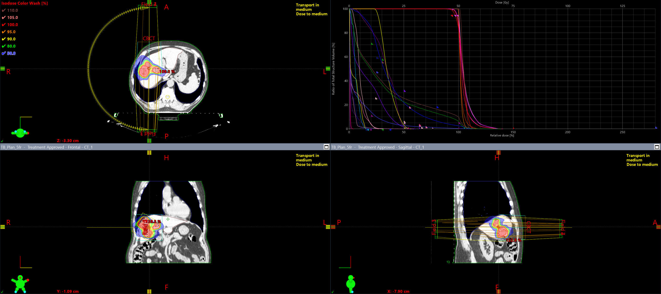 Пациент направлен на лечение на аппарат Varian Truebeam. После КТ-топометрии на задержке дыхания и МРТ-топометрии выполнен физико-дозиметрический расчет.